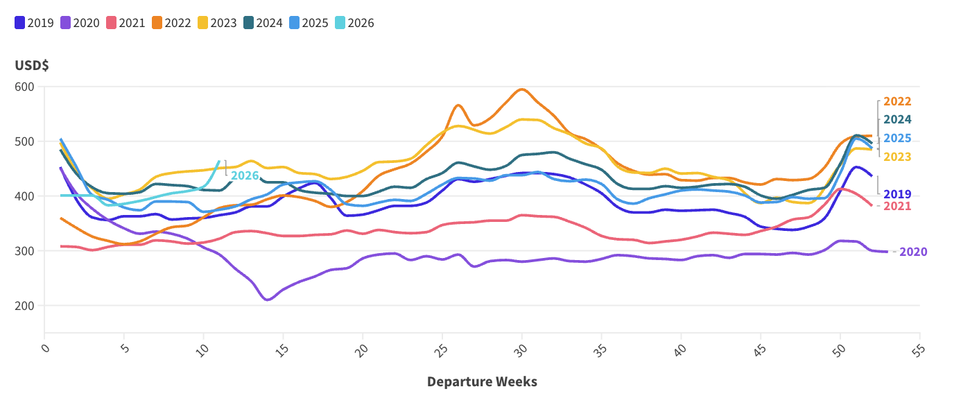 The impact on ticket prices is already measurable. Average airfares for the week beginning March 9 were up 24% compared to the same week in 2025, with the average ticket price sitting at $465 – the highest price since 2019, according to travel data provider OAG.
